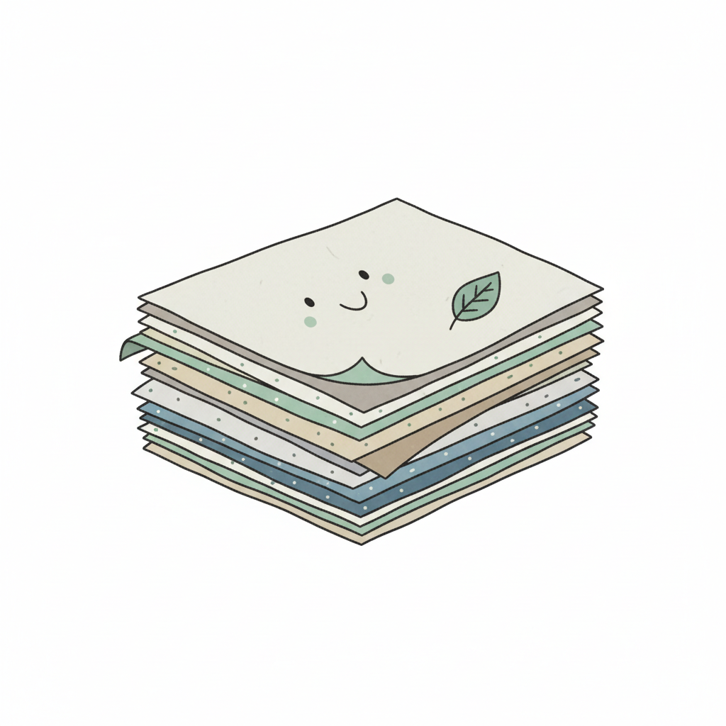 Niedlicher Stapel Recyclingpapier mit lächelndem Gesicht und 'RECYCLED'-Schild, umgeben von Blättern.