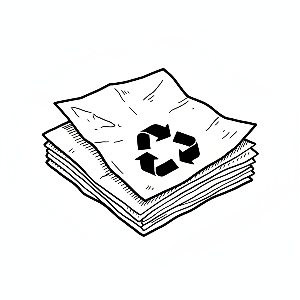 Schwarz-weiße Skizze eines Papierstapels mit Recyclingsymbol im Doodle-Stil.