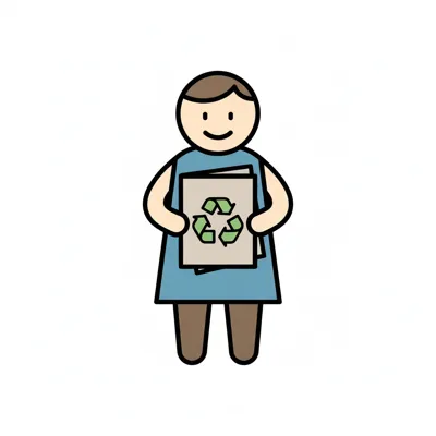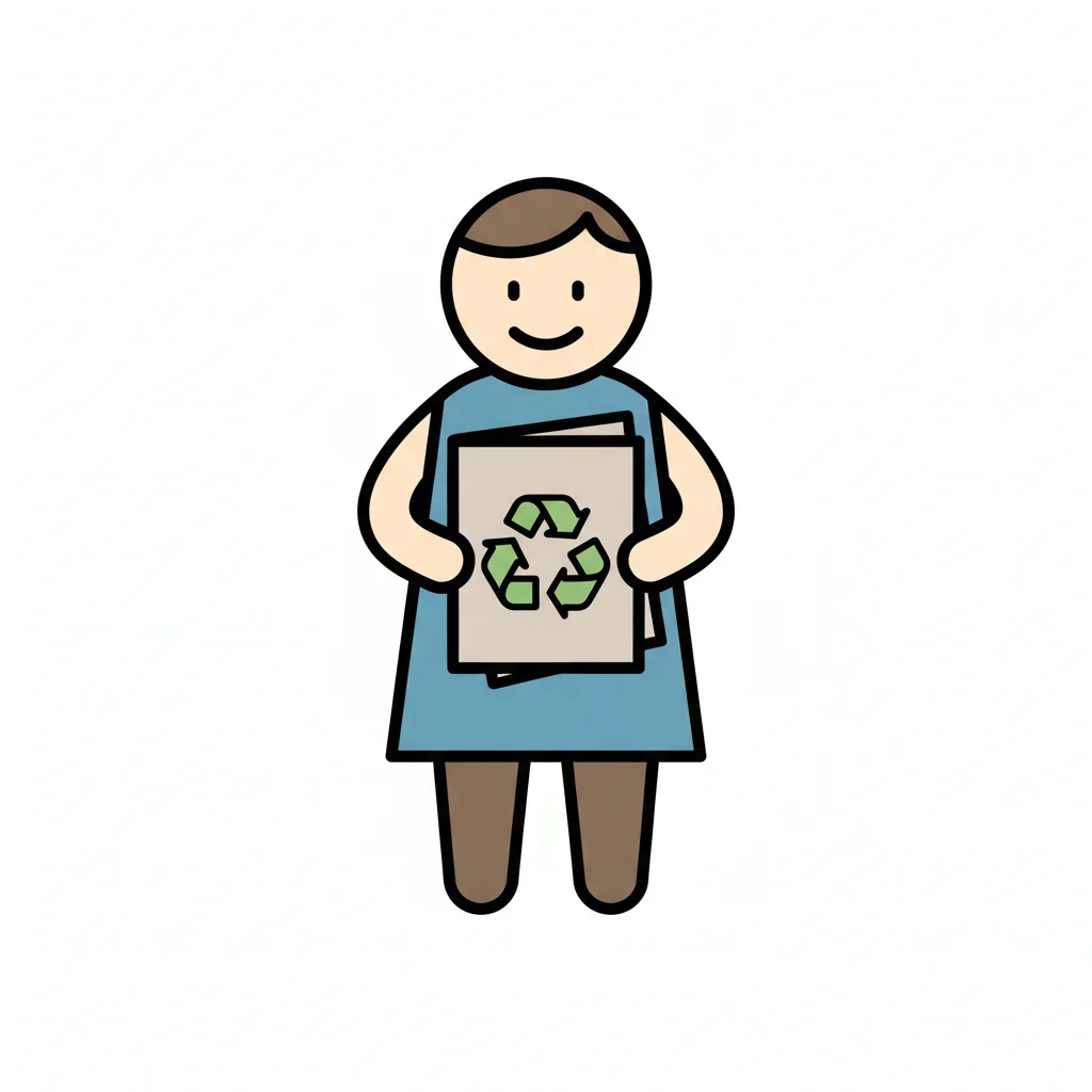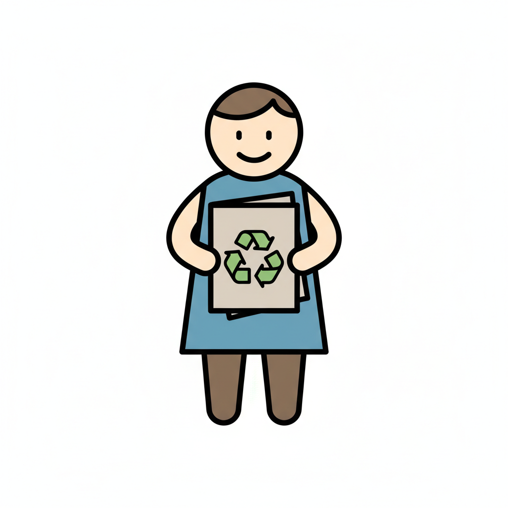 Lachende Figur hält Papier mit Recycling-Zeichen, symbolisiert Umweltschutz.