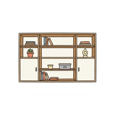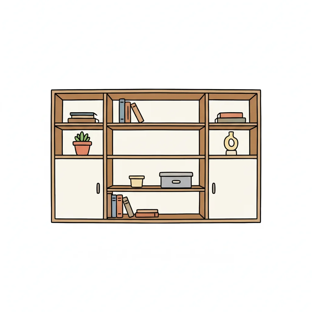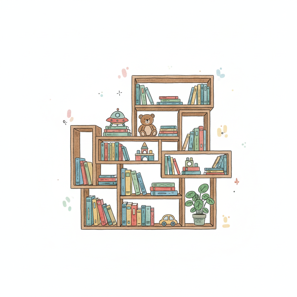 Buntes Regal mit Büchern, Spielzeug und Pflanze, schafft eine gemütliche Atmosphäre.