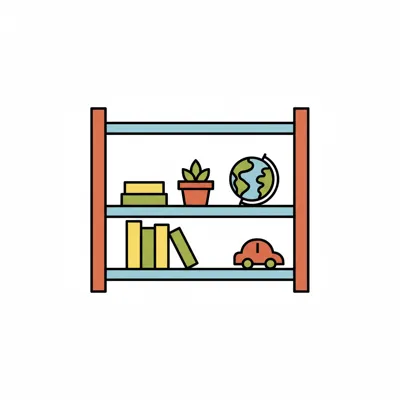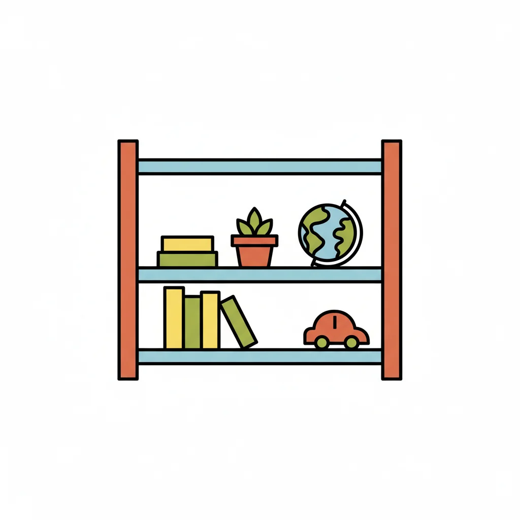 Regal mit Büchern, Pflanze, Weltkugel und einem Spielzeugauto.