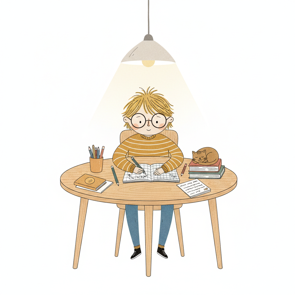 Ein Junge sitzt an einem Tisch und schreibt, eine Katze liegt auf den Büchern.