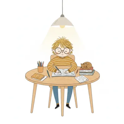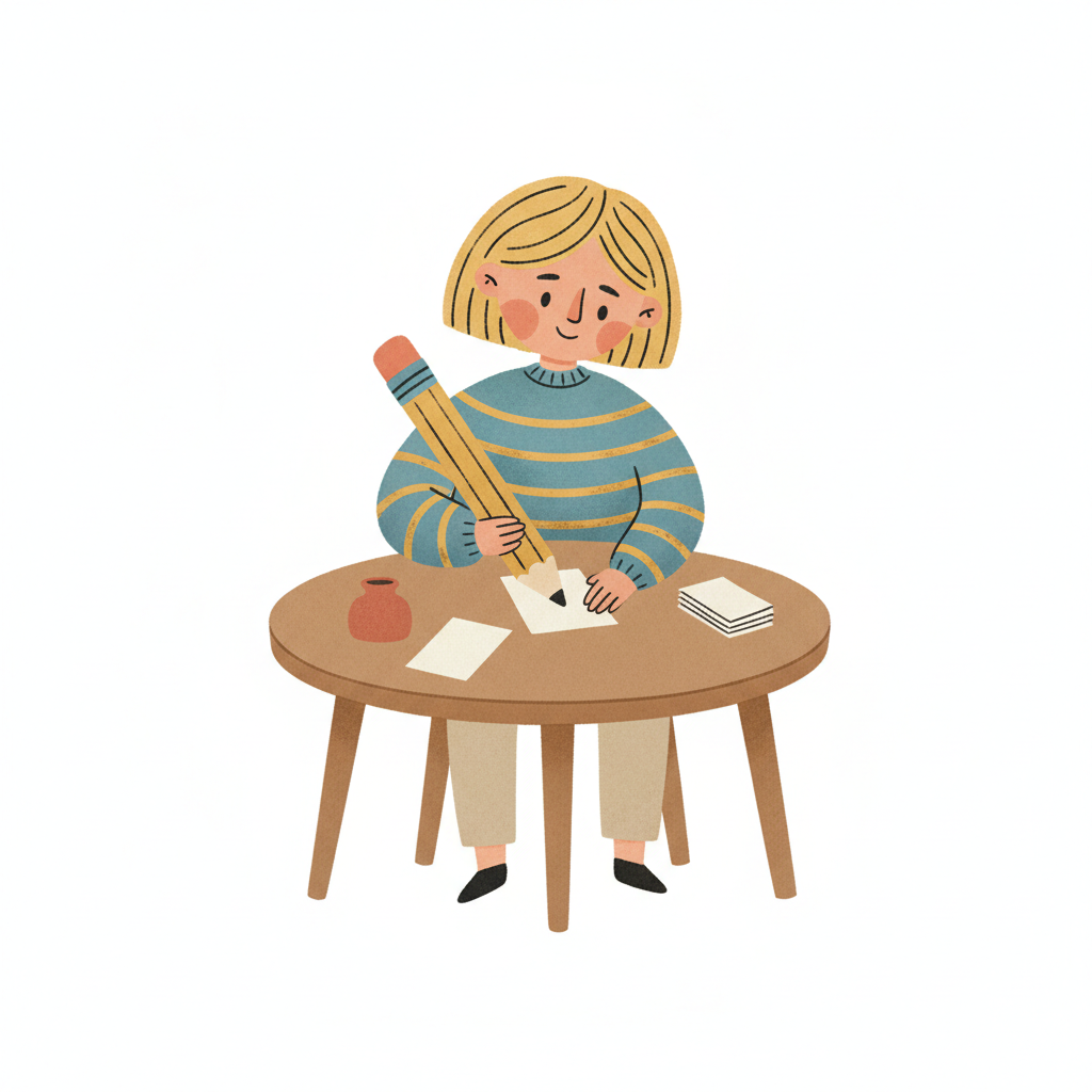 Handgezeichnete Kinderbuchillustration im modernen skandinavisch-nordischen Stil. Minimalistische, freundliche Figur mit einfachen Formen und leicht unregelmäßigen, handgezeichneten Linien. Ruhige, gedeckte Farbpalette, viel freie Fläche, reduzierte Details, sanfte Papier- oder Aquarellstruktur. Warme, ruhige, leicht humorvolle Stimmung, flächige Komposition ohne starke Perspektive, moderner nordischer Illustrationsstil, charmant und zeitlos.