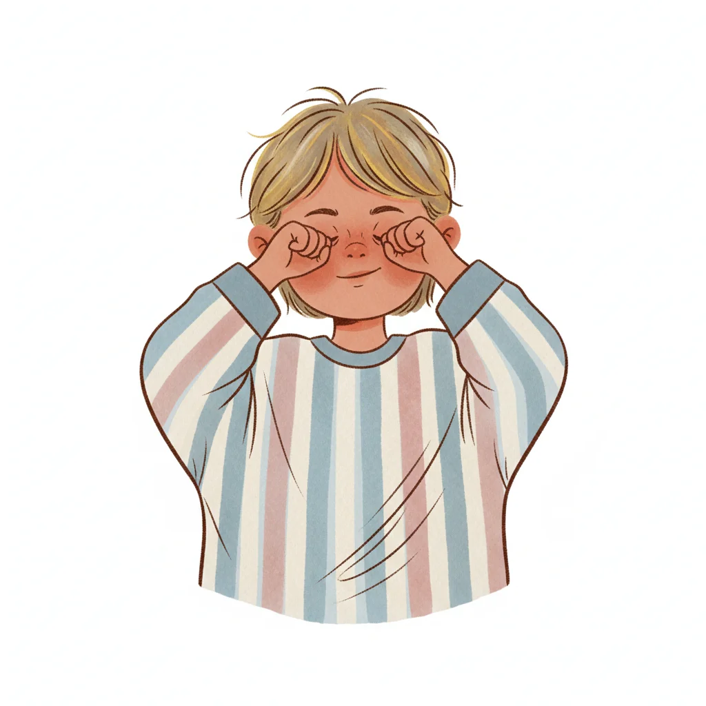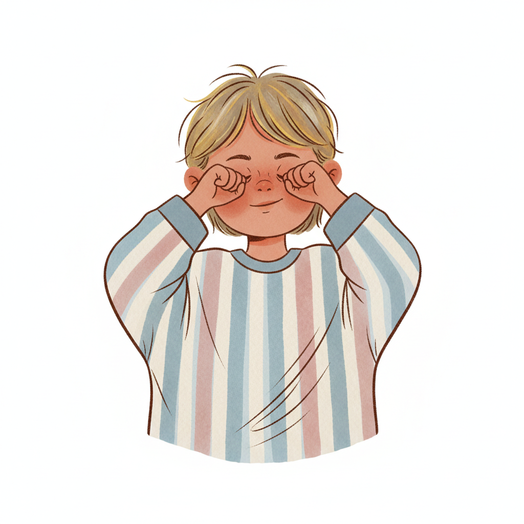 Ein Junge mit blonden Haaren, der die Augen reibt und lächelt.