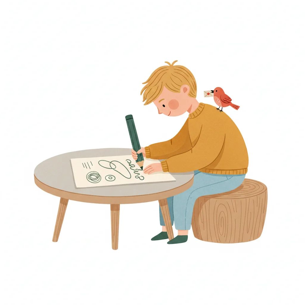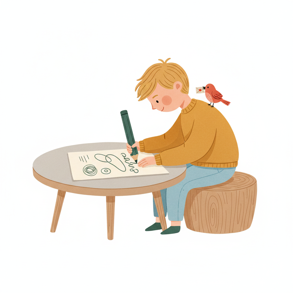Ein Junge zeichnet an einem Tisch mit einem Vogel auf seiner Schulter.