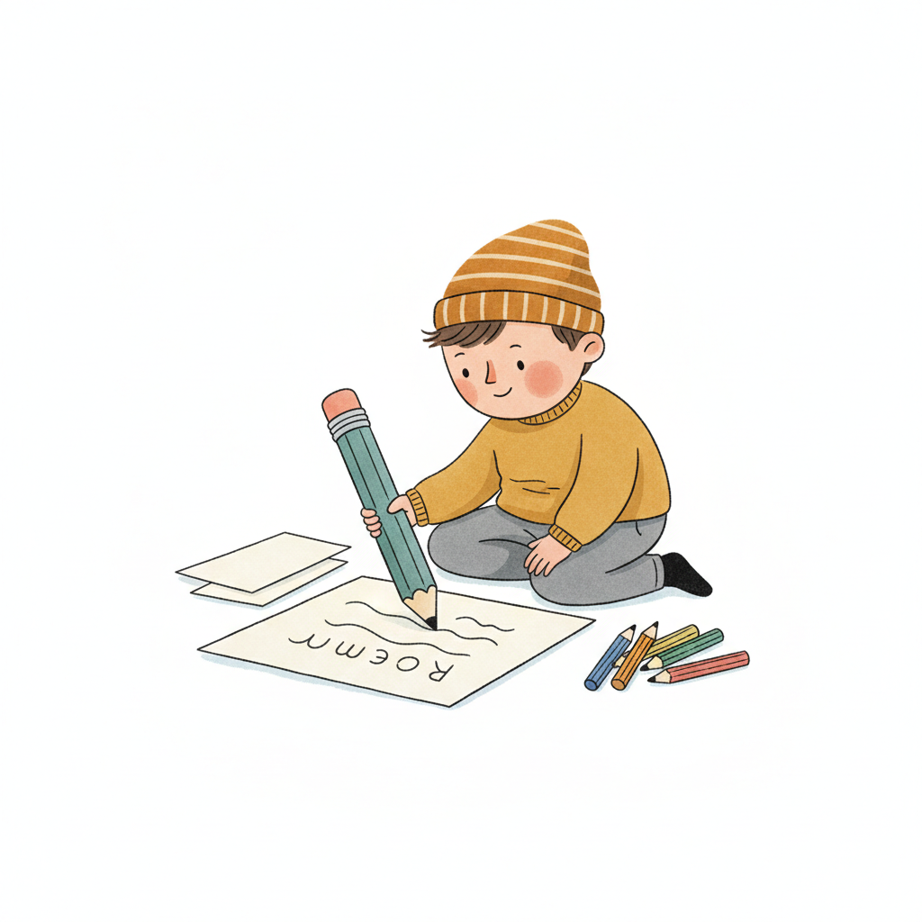 Ein Junge zeichnet mit einem großen Bleistift auf ein Blatt Papier.