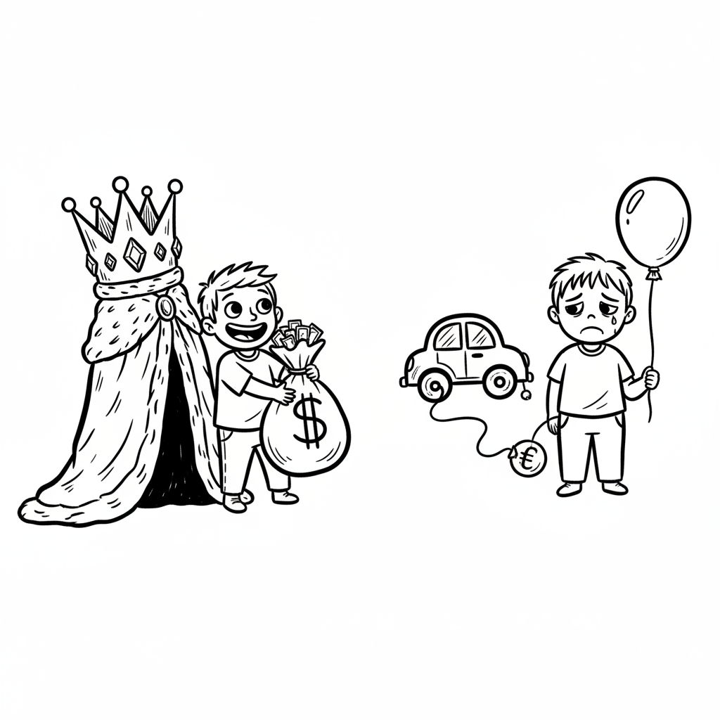 Reicher Junge als König mit Geldsack, armer Junge mit Ballon und Euro-Fessel am Spielzeugauto.