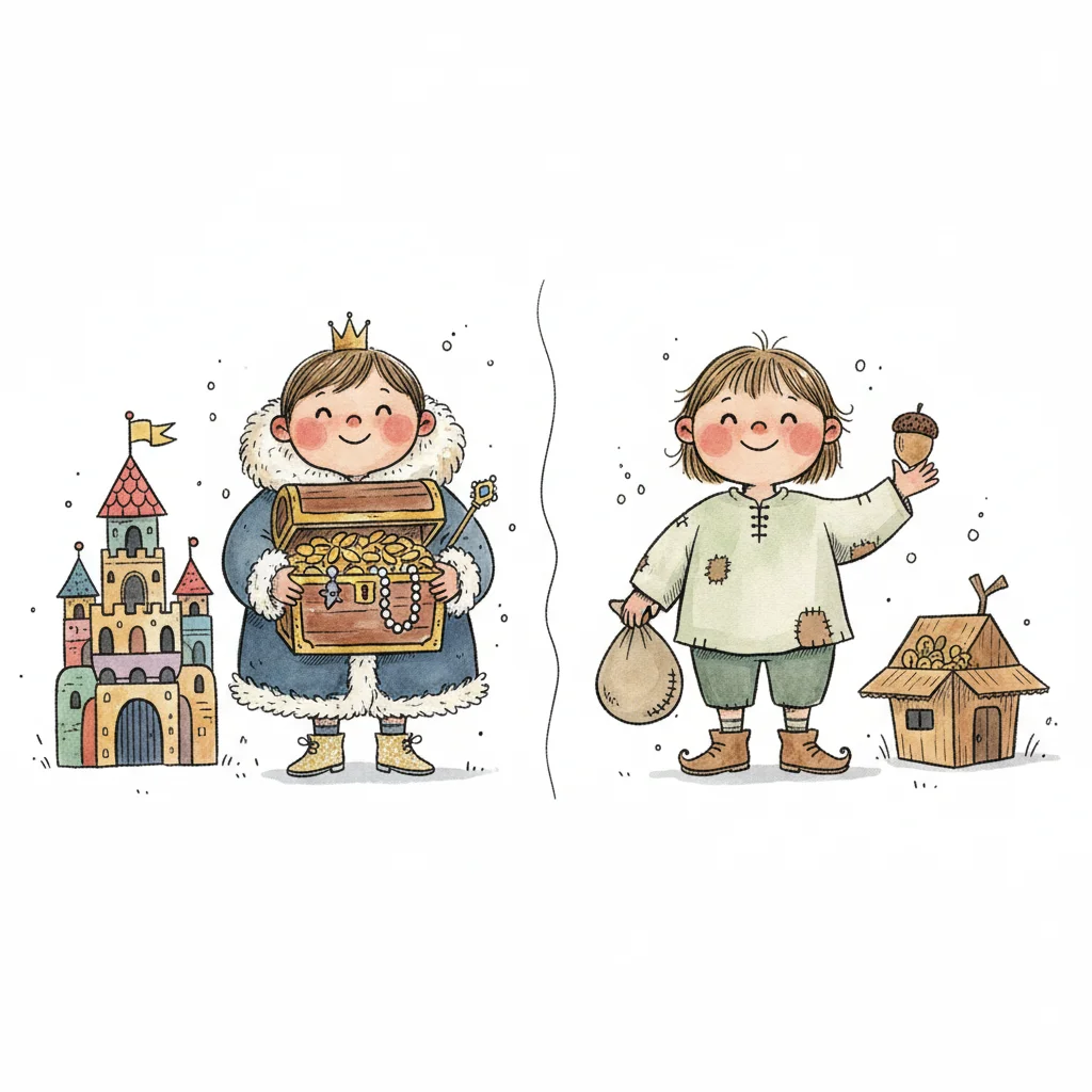 Zwei glückliche Kinder: Eines reich mit Schatz und Schloss, das andere arm mit Eicheln.