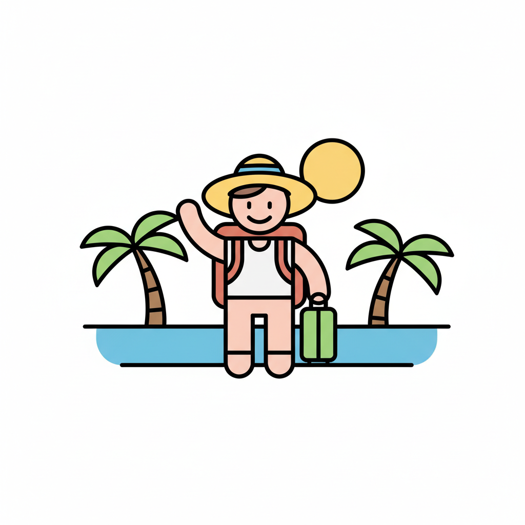 Person am Strand mit Koffer und Sonnenhut vor Palmen.