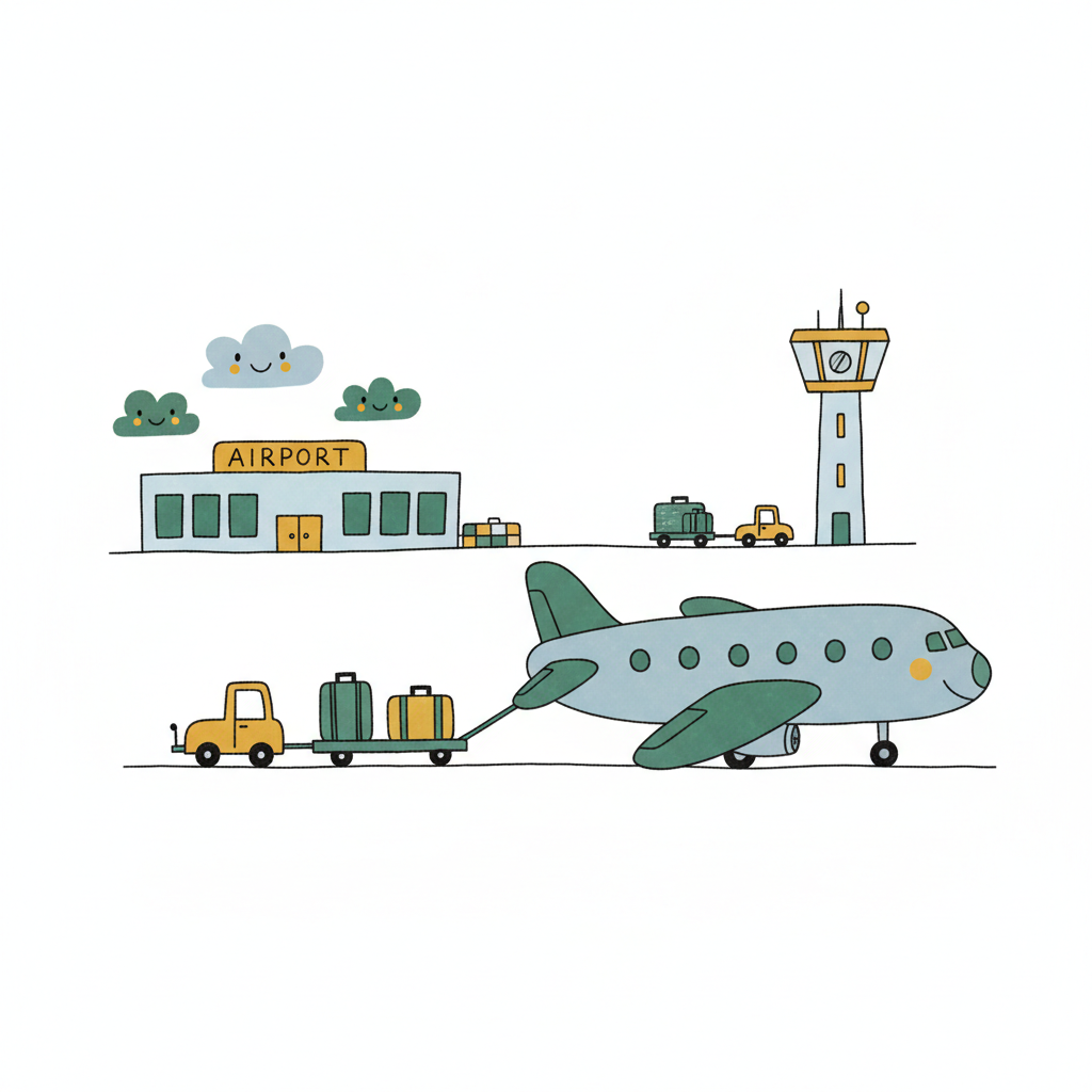 Eine farbenfrohe Zeichnung eines Flughafens mit einem Flugzeug und Gepäckwagen.