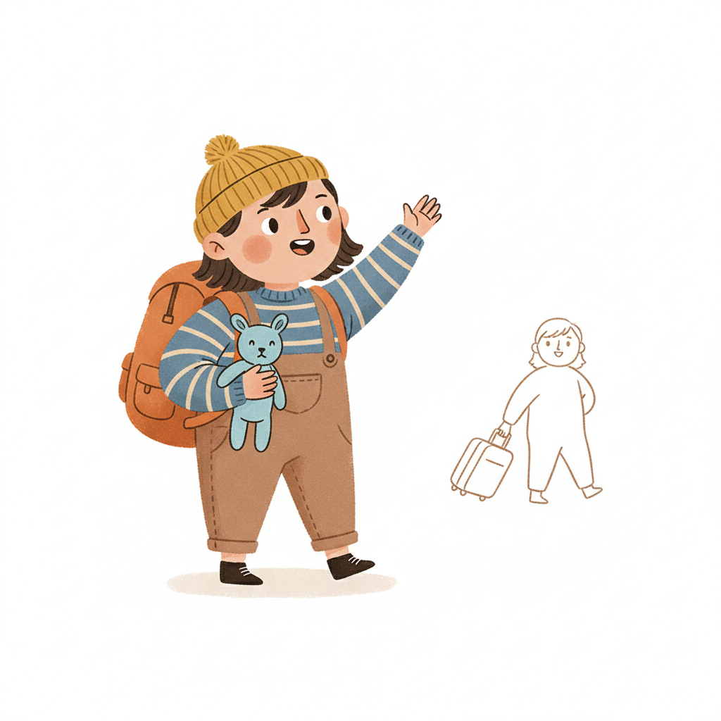 Ein Kind winkt mit einem Koffer in der Hand.