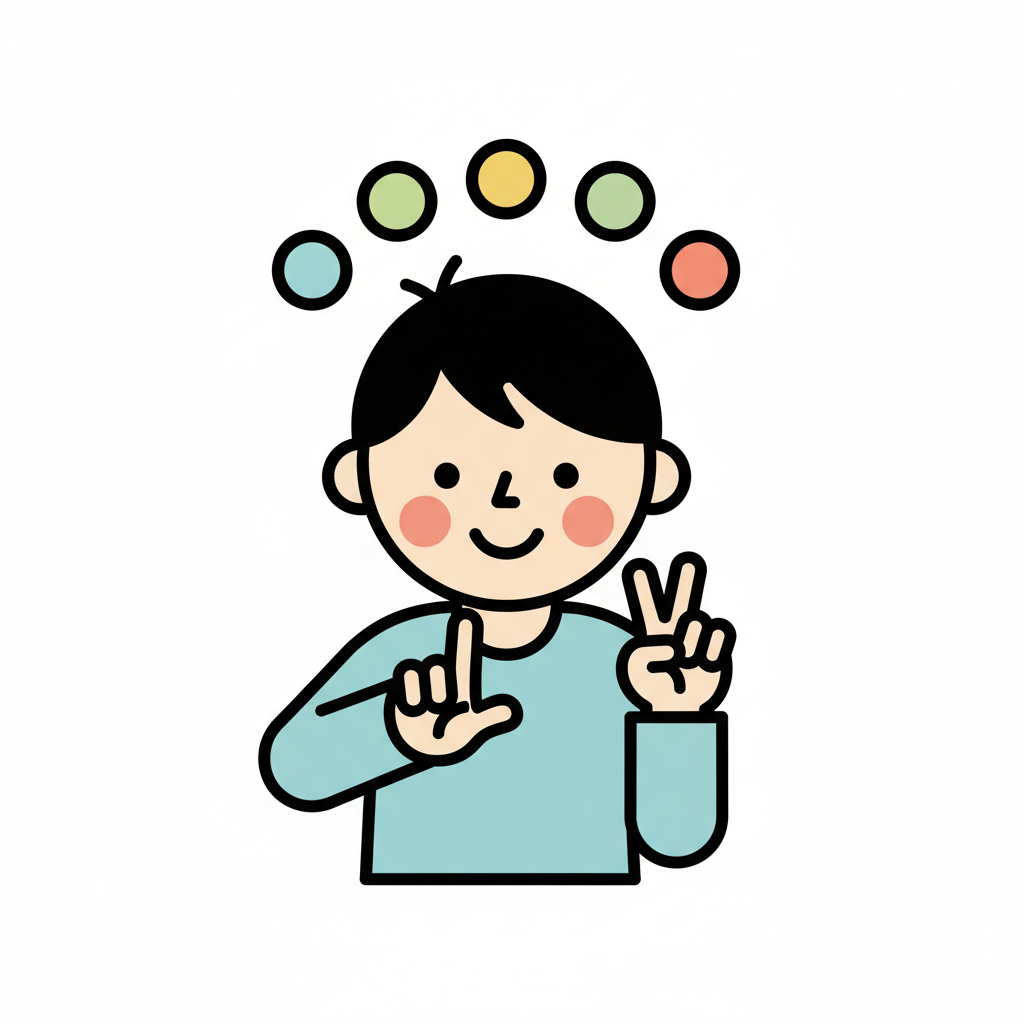 Ein fröhlicher Junge mit bunten Kreisen über dem Kopf macht ein Peace-Zeichen.