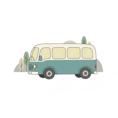 Ein stilisierter Bus mit einem grünen Design vor einer sanften Landschaft.