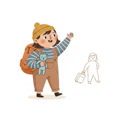Ein Kind mit einem Teddy winkt und trägt einen Rucksack.