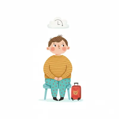 Ein Junge sitzt auf einem Stuhl mit einem Koffer, wirkt nachdenklich.