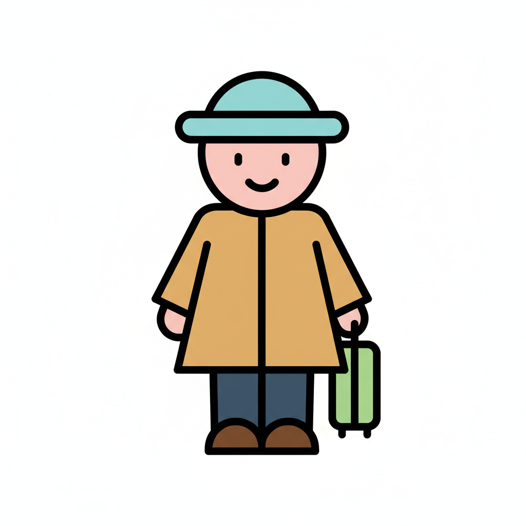 Lächelnde Cartoon-Figur mit Hut und Mantel, die einen grünen Koffer zieht.