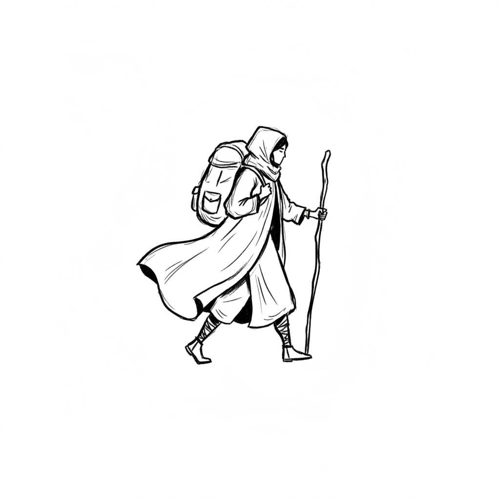 Schwarz-weiße Illustration eines Reisenden mit Kapuze, Rucksack und Wanderstock.