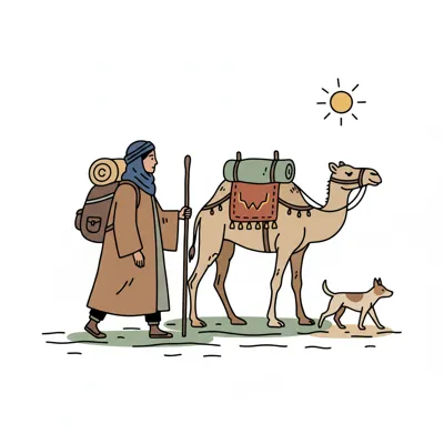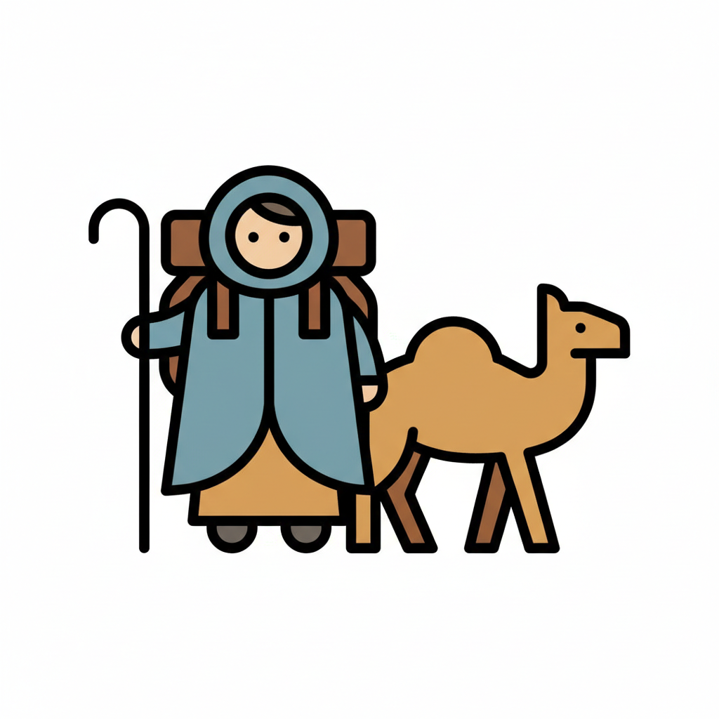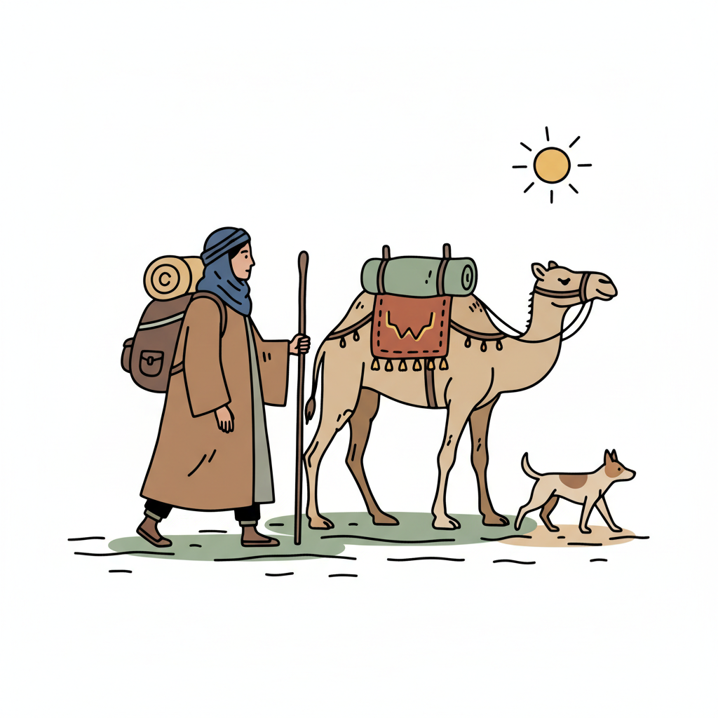 Ein stilisierter Reisender mit Stab und Rucksack steht neben einem Kamel.