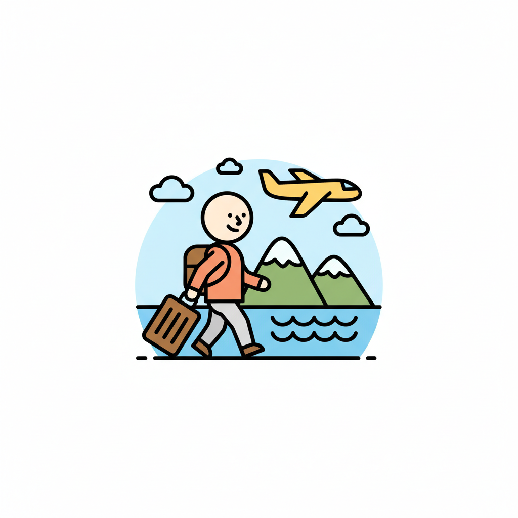 Ein lächelnder Reisender mit Rucksack und Koffer vor einer Landschaft mit Bergen, Meer und Flugzeug.