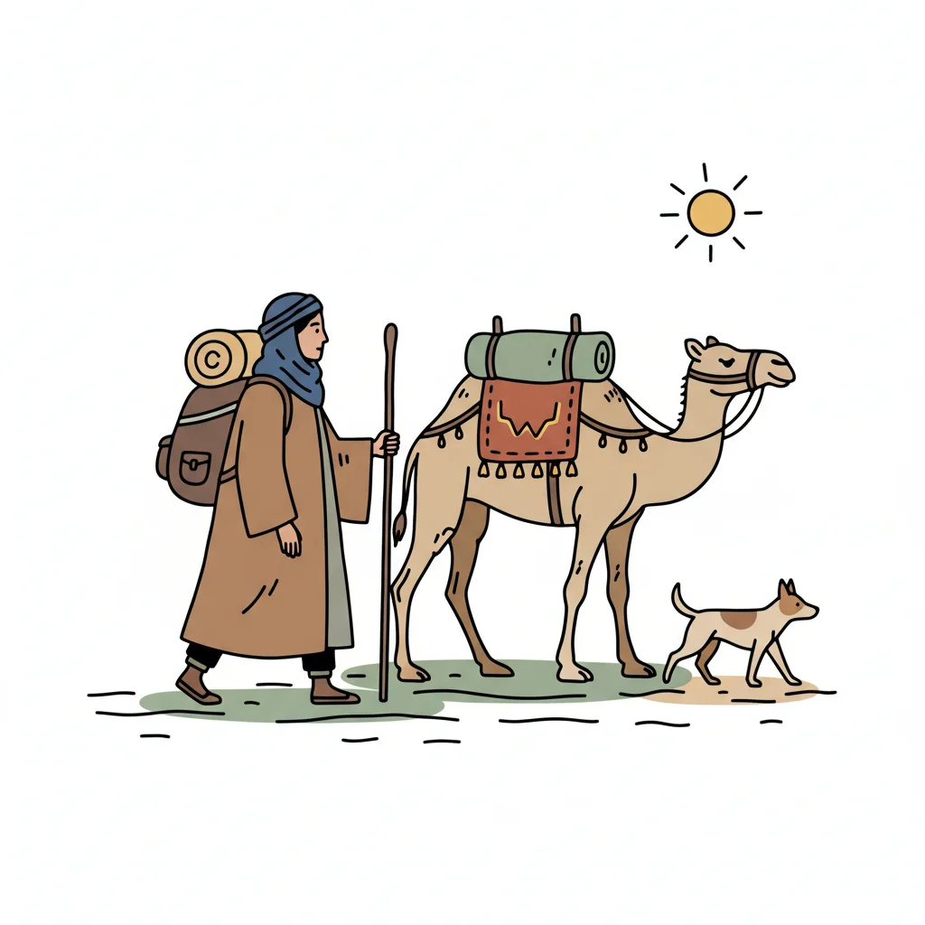 Ein Reisender mit Rucksack und Stab geht mit einem Kamel und Hund durch die Wüste unter der Sonne.