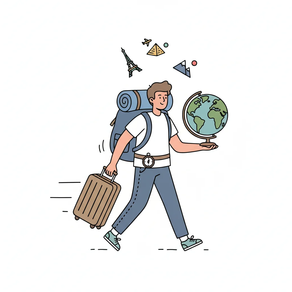 Ein Reisender hält einen Globus, umgeben von Wahrzeichen wie Eiffelturm, Pyramiden und Heißluftballon.