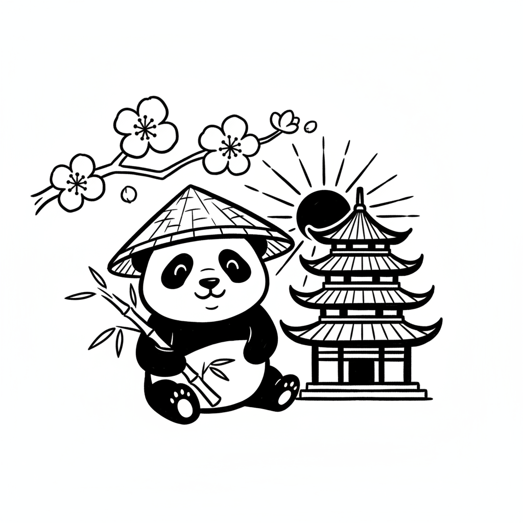 Niedlicher Panda mit Reishut, Bambus, Pagode und Kirschblüten im asiatischen Stil.