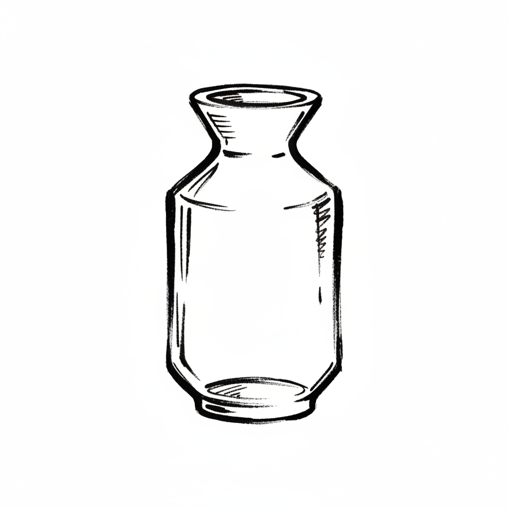 Handgezeichnete, leere Vase in Schwarz-Weiß mit schmalem Hals und breiterem Korpus.