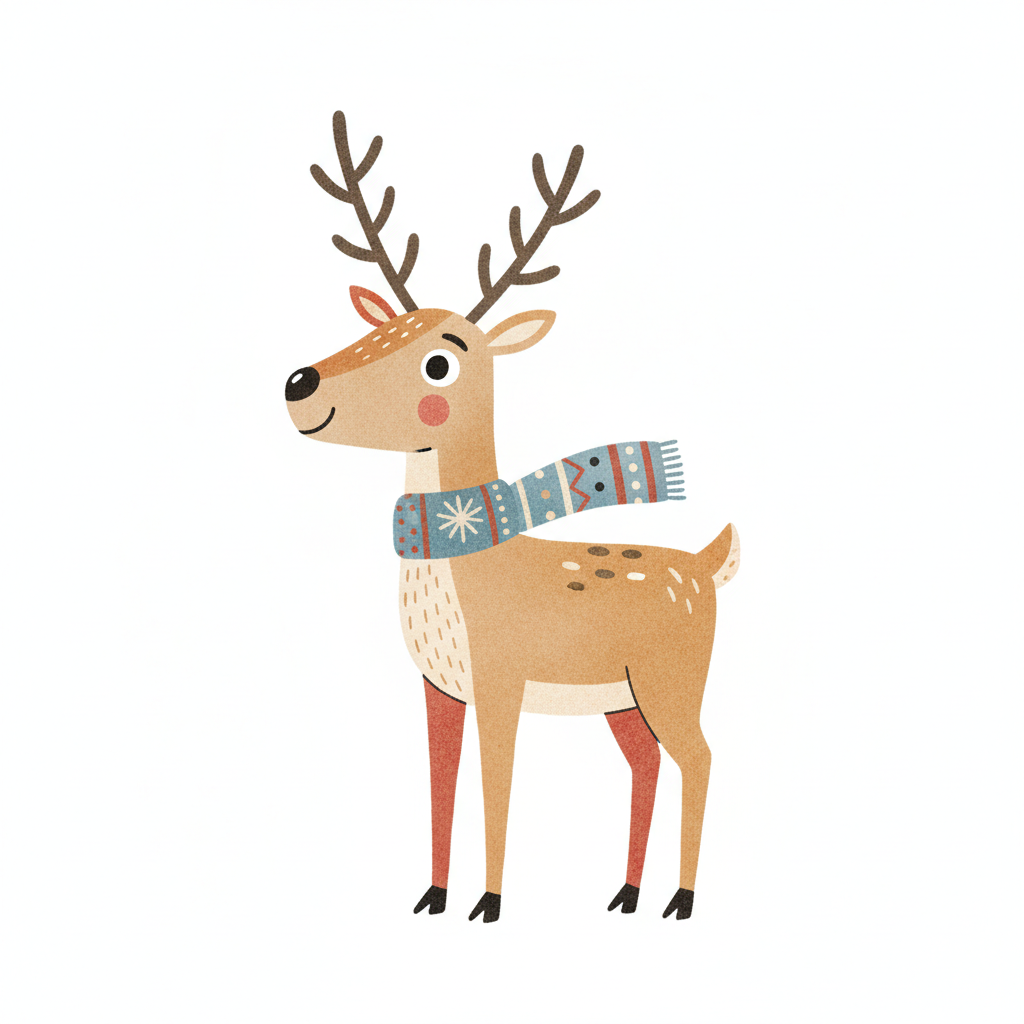 Ein fröhliches Rentier mit Schal, in einem kartenspielähnlichen Design.