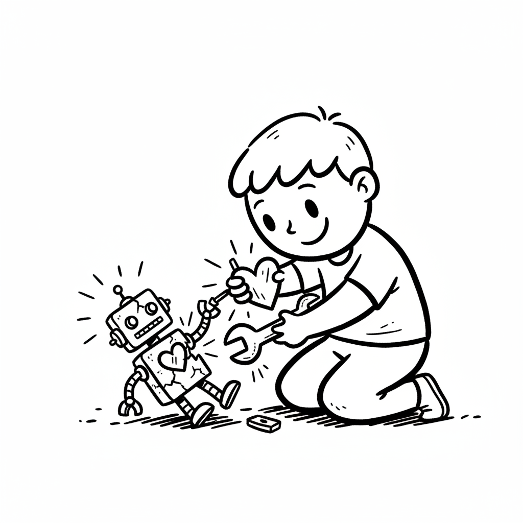 Junge repariert liebevoll einen Roboter mit gebrochenem Herzen, bringt ihn zum Leuchten.