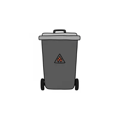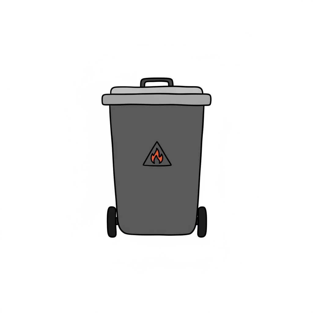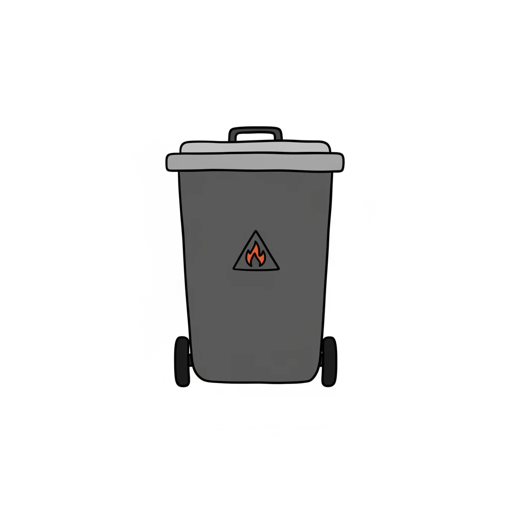 Graue Mülltonne mit Rädern und einem Flammen-Warnsymbol in Cartoon-Stil.