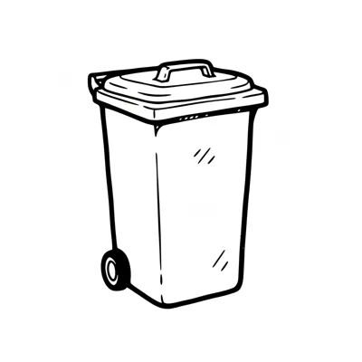 Schwarz-weiße Strichzeichnung einer Mülltonne mit Deckel und Rad.