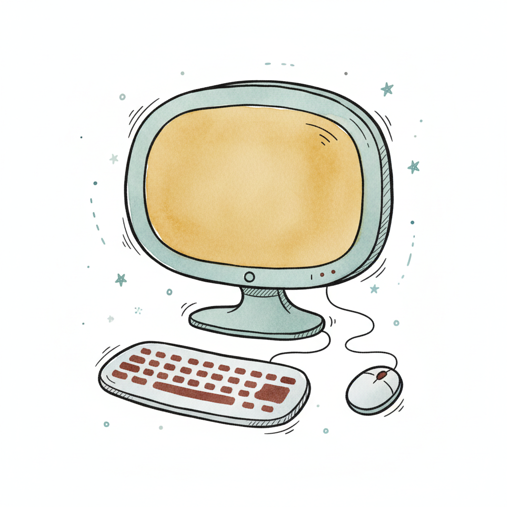 Handgezeichneter Retro-Computer mit Monitor, Tastatur und Maus auf Holztisch, umgeben von Funkeln.