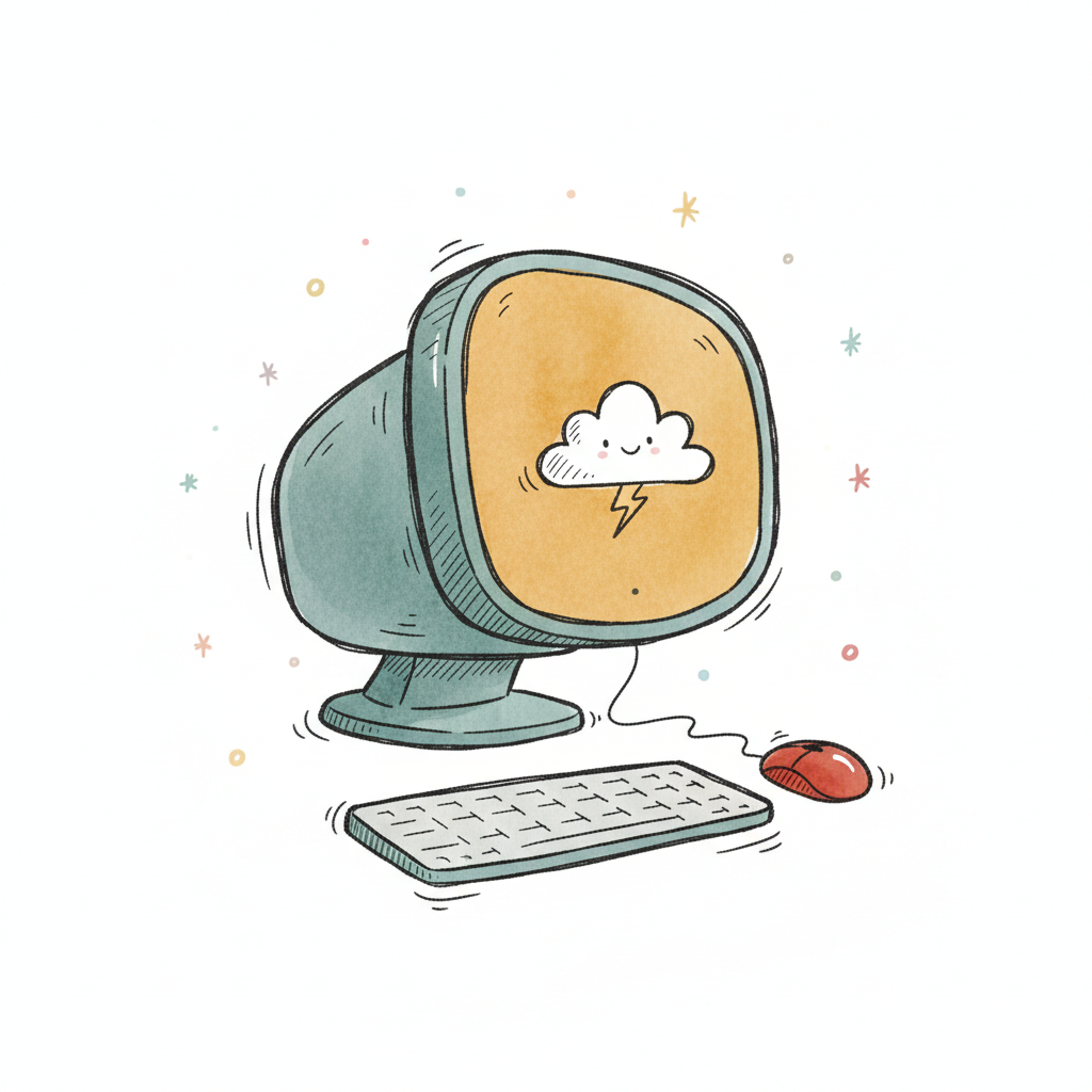 Niedliche Illustration eines Retro-Computers mit einer lächelnden Blitzwolke auf dem Bildschirm.