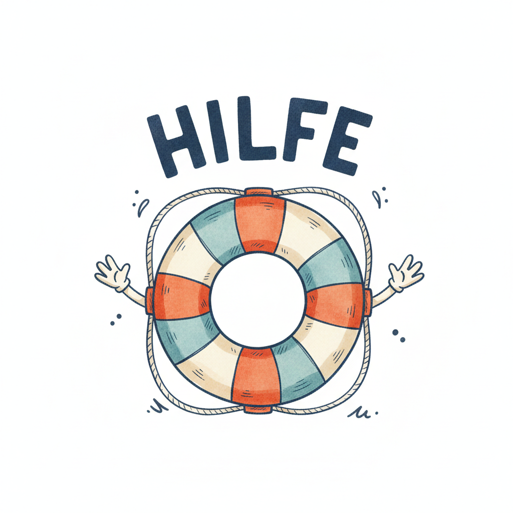 Roter Rettungsring mit der Aufschrift "HILFE" und einem Seil, illustriert im Aquarellstil.