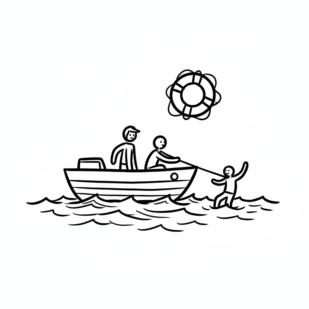 Zwei Personen in einem Boot ziehen eine dritte Person aus dem Wasser. Ein Rettungsring schwebt.