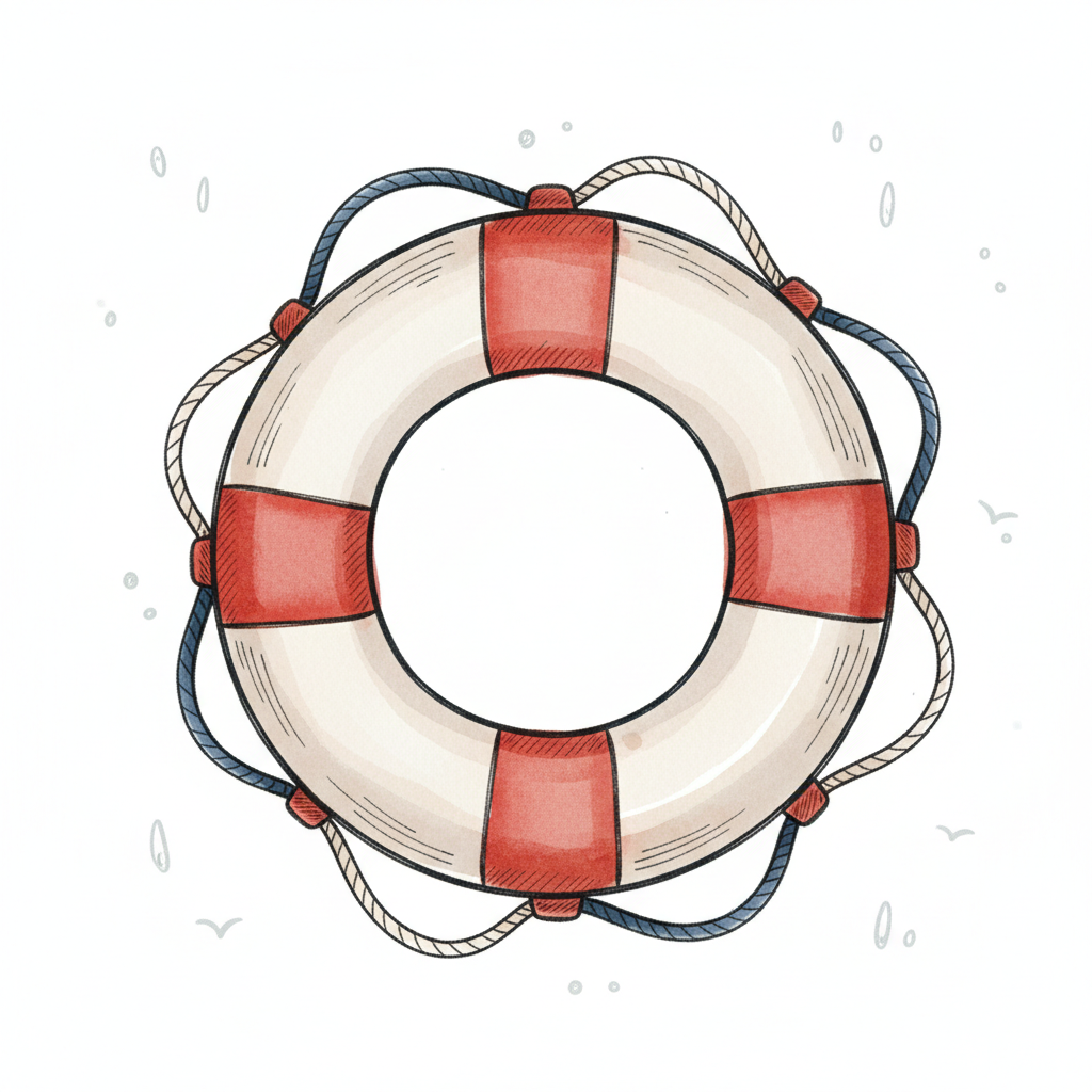 Handgezeichneter rot-weißer Rettungsring mit Seil, umgeben von stilisierten Wasserwellen.