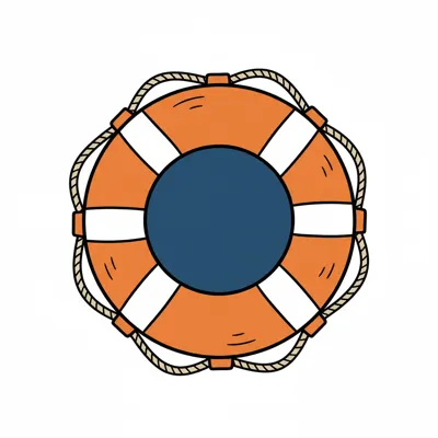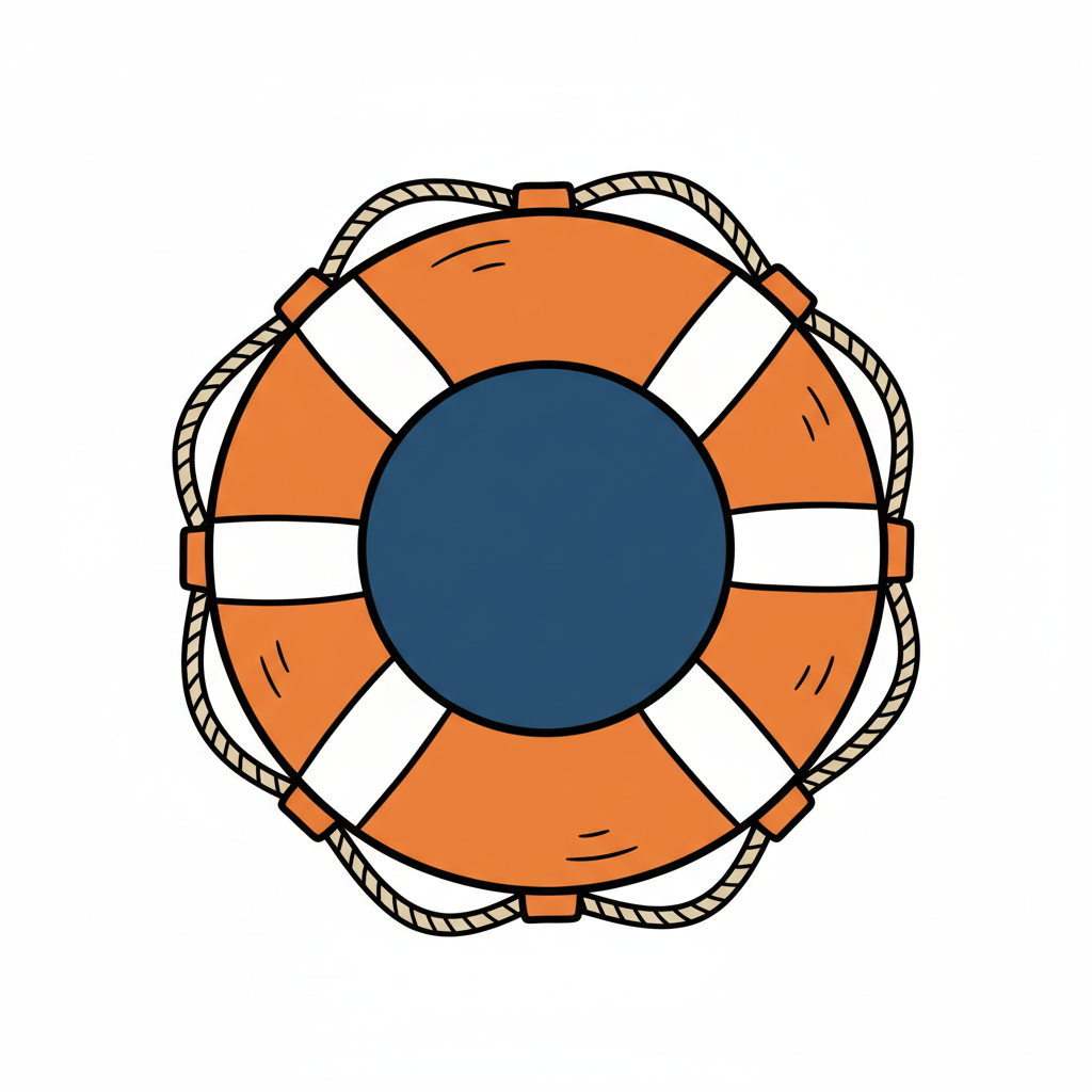 Cartoon-Illustration eines orangefarbenen Rettungsrings mit weißen Streifen, blauem Zentrum und Seil.