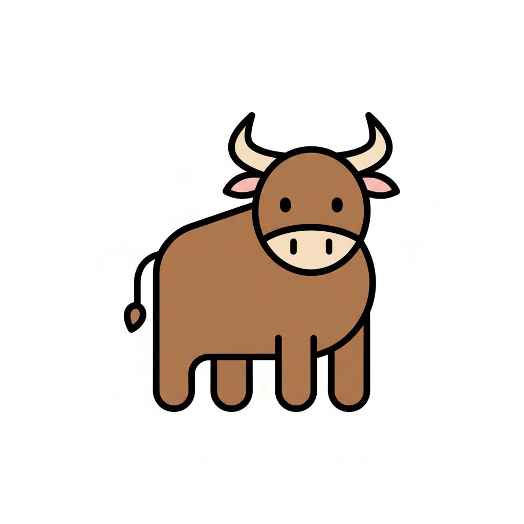Ein cartoonhaftes braunes Rind mit Hörnern und freundlichem Gesicht.