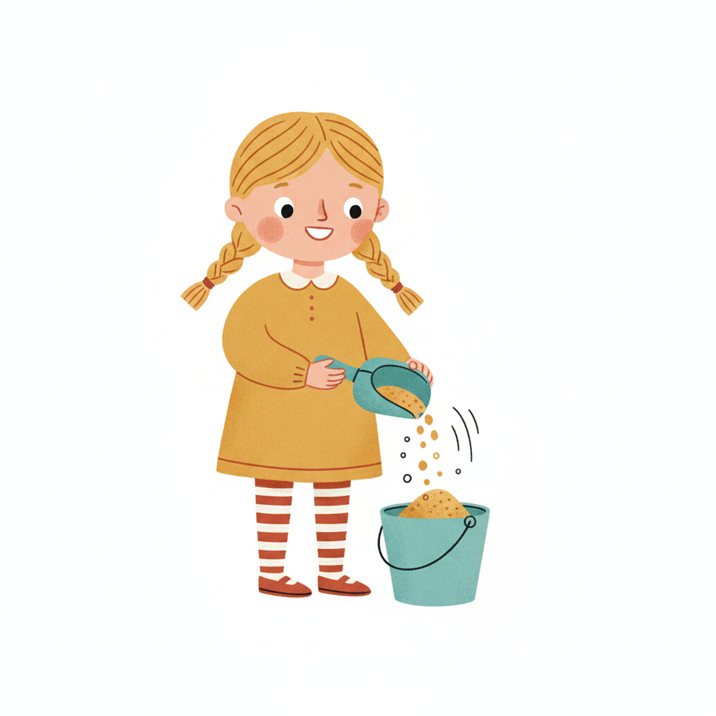 Ein lächelndes Cartoon-Mädchen mit Zöpfen füllt Sand mit einer Schaufel in einen Eimer.