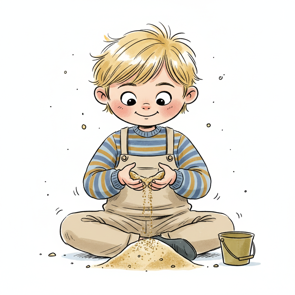 Ein lächelnder Cartoon-Junge mit blonden Haaren spielt mit Sand, lässt ihn durch seine Finger rieseln.