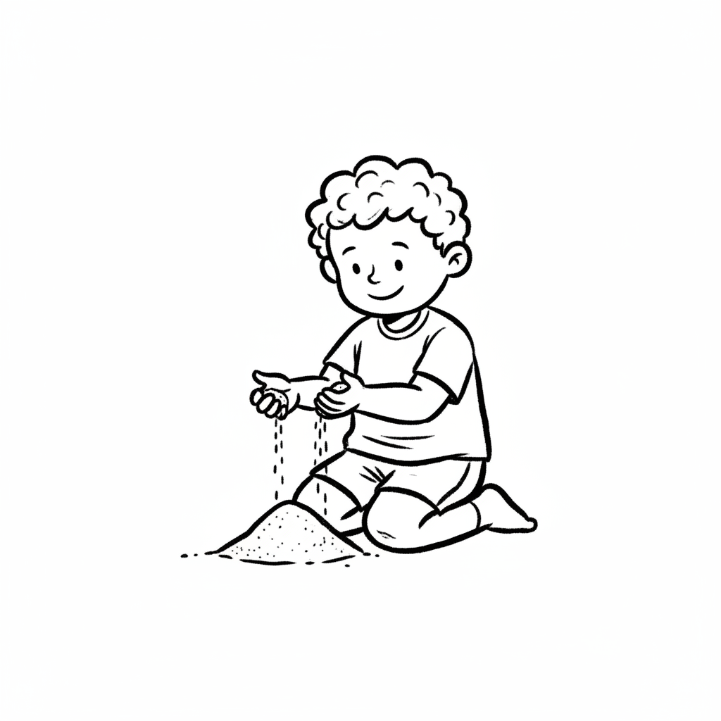 Ein lächelnder Cartoon-Junge kniet und lässt Sand durch seine Hände rieseln.