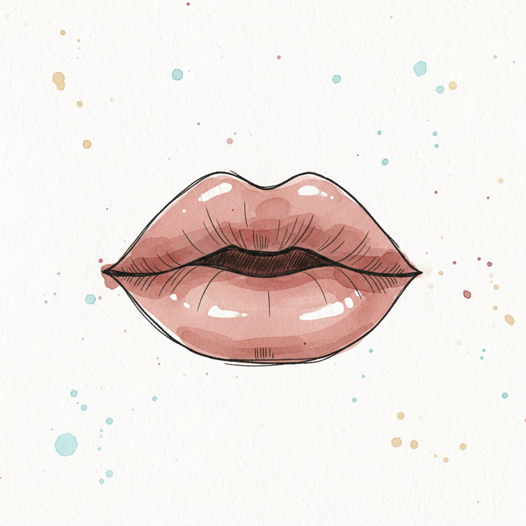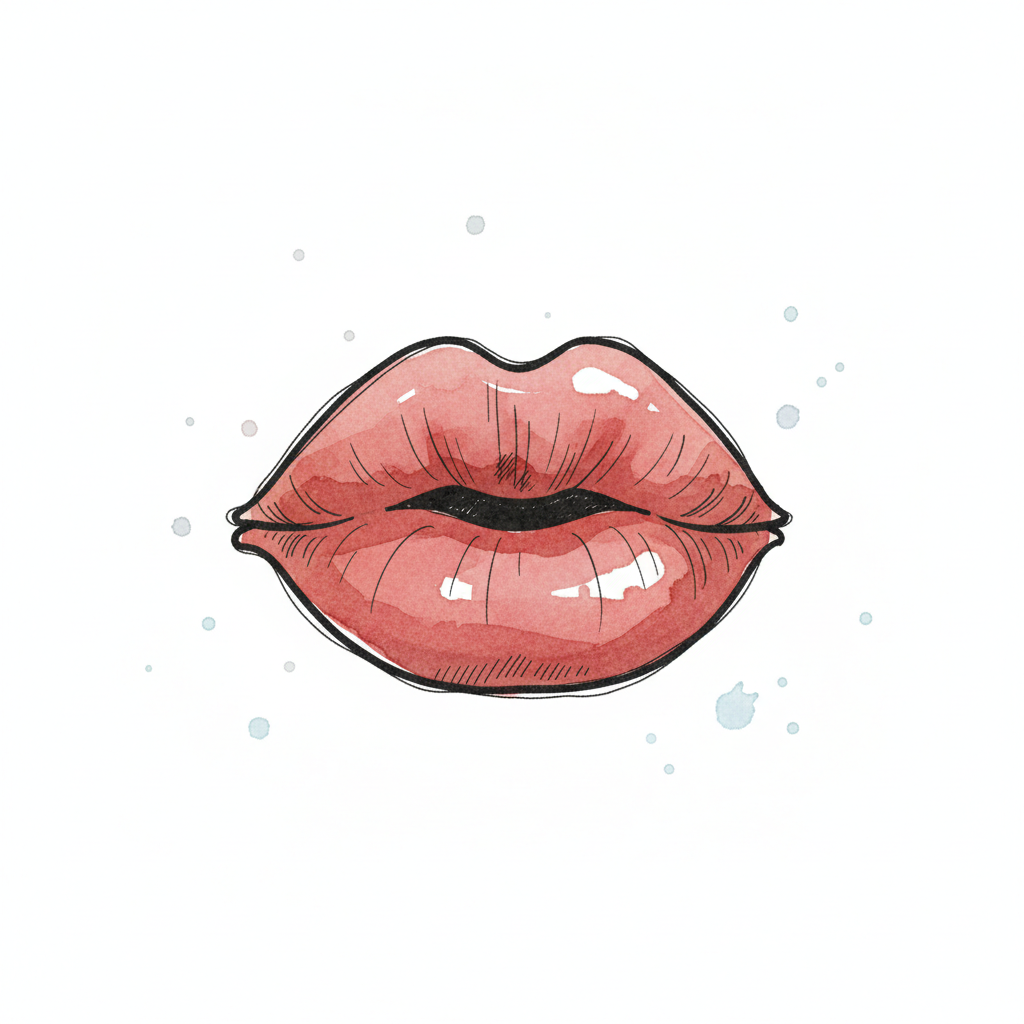 Stilisierte Aquarell-Lippen in Rot mit Glanz und skizzenhaften Umrissen auf weißem Hintergrund.