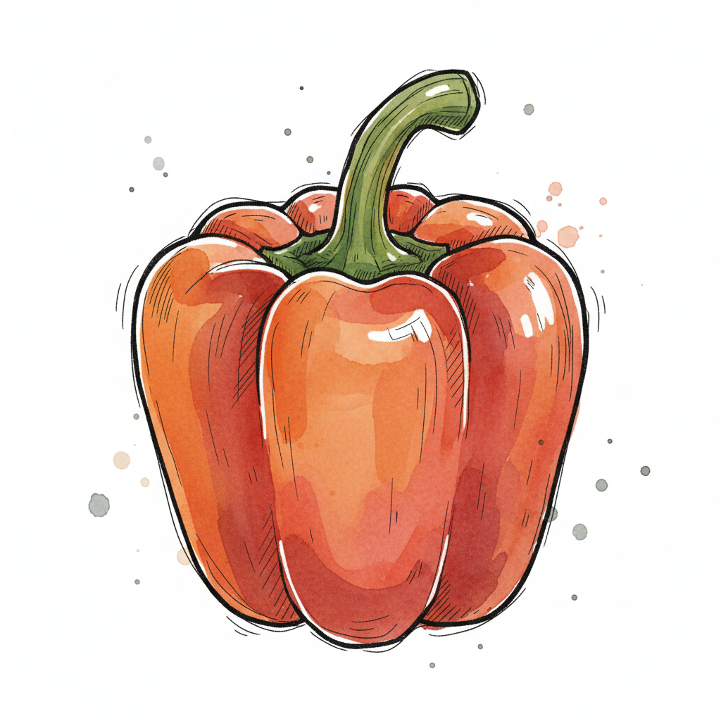 Illustration eines roten Paprikas in Aquarell-Optik mit schwarzen Umrissen auf weißem Hintergrund.