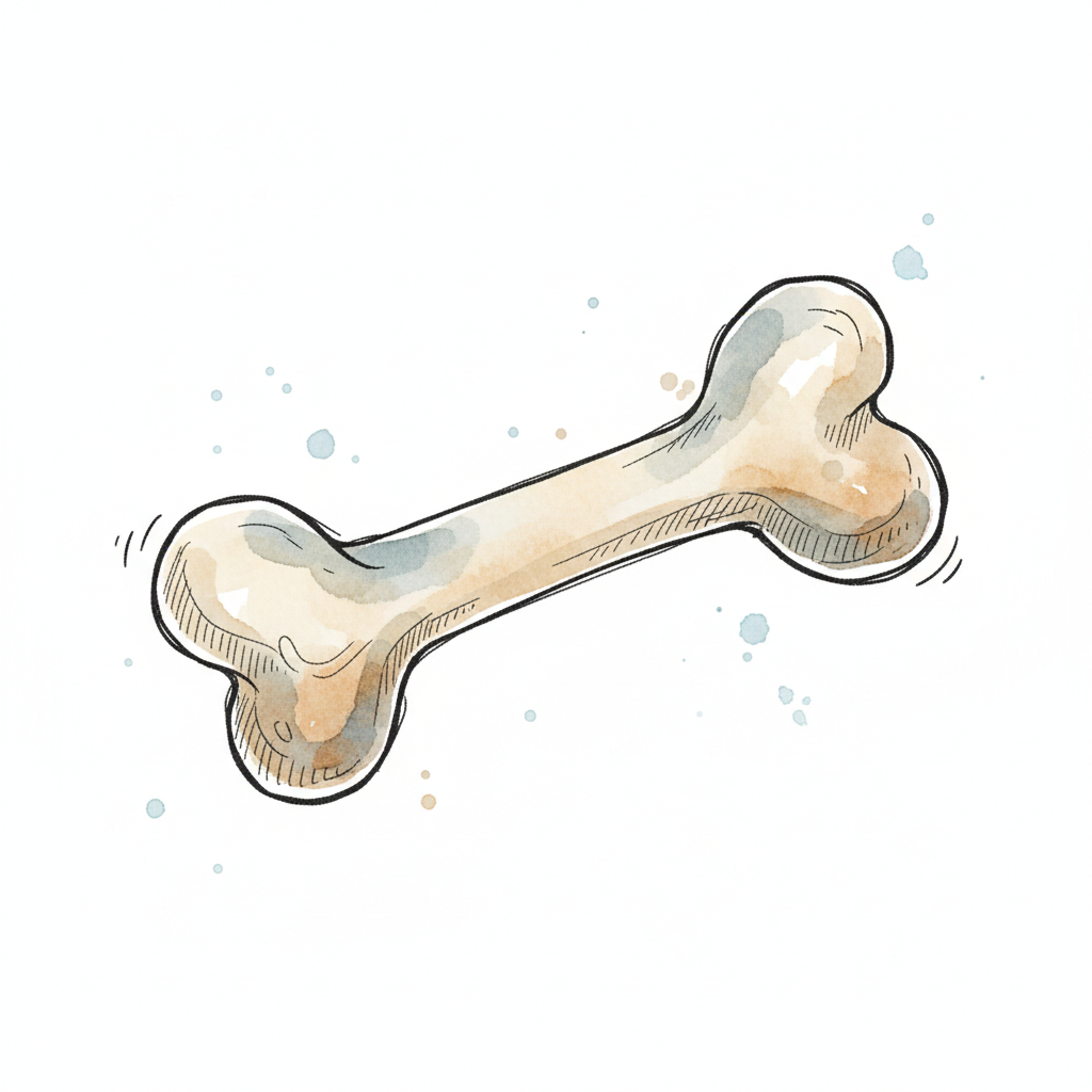 Aquarell-Illustration eines Knochens mit schwarzen Umrissen und Farbspritzern auf weißem Grund.