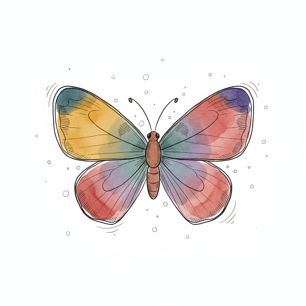 Bunter Aquarell-Schmetterling mit schwarzen Umrissen auf weißem Hintergrund und kleinen Punkten.