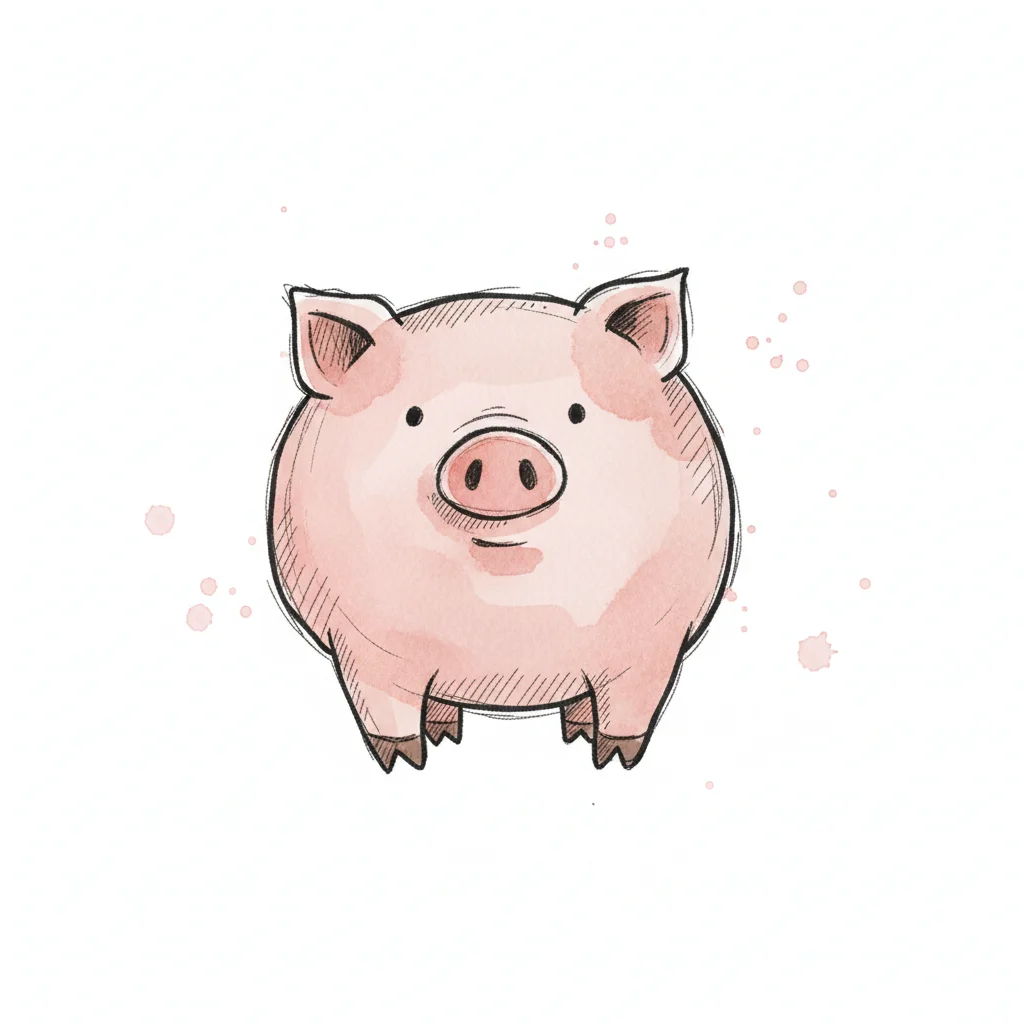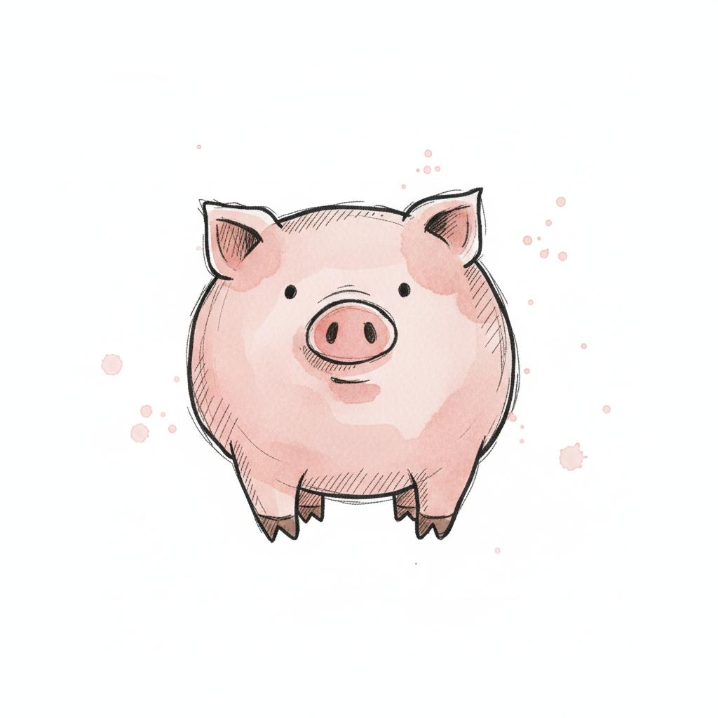 Niedliches rosa Schwein im Aquarell-Stil mit schwarzen Umrissen auf weißem Hintergrund.