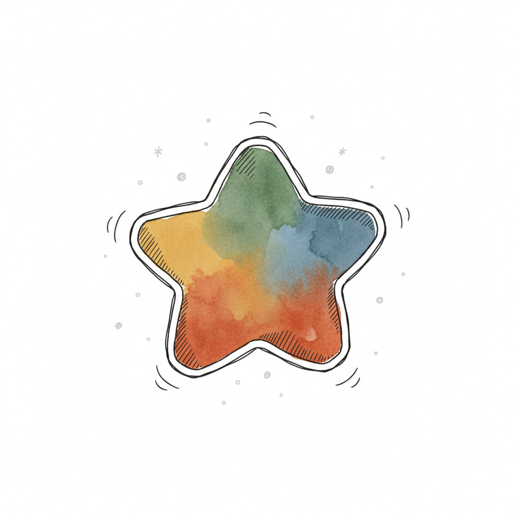 Bunter Aquarell-Stern mit skizziertem Umriss und kleinen Details auf weißem Hintergrund.