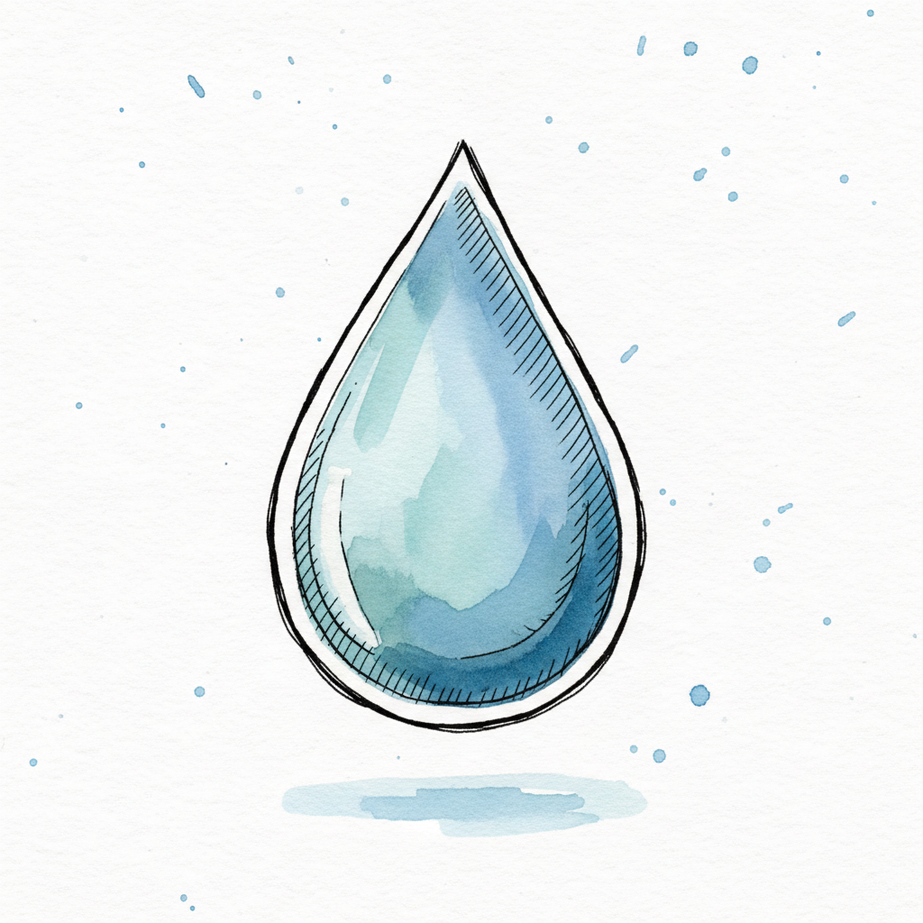 Aquarell-Illustration eines blauen Wassertropfens mit schwarzem Umriss und Spritzern.