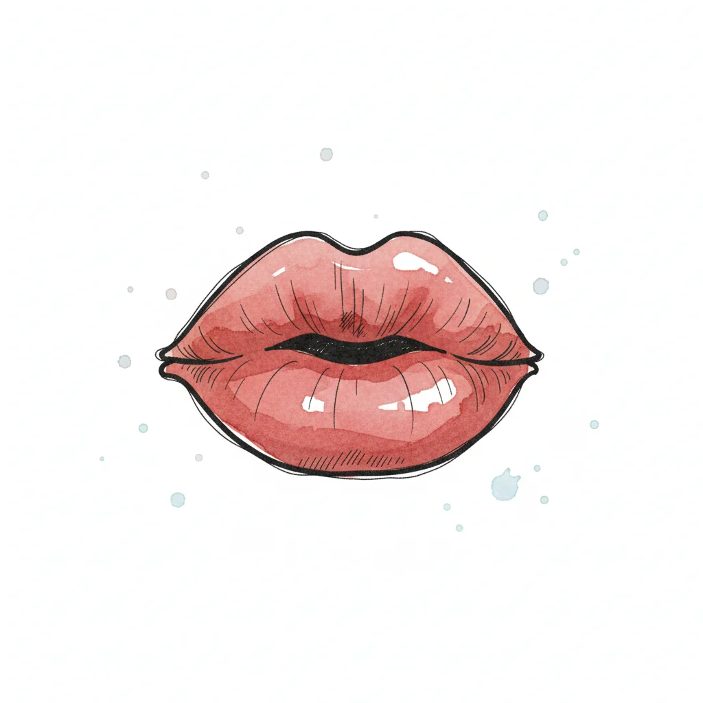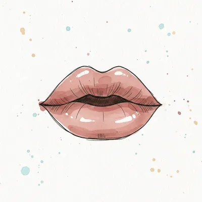 Aquarell-Illustration von glänzenden, rosafarbenen Lippen mit schwarzem Umriss und Farbspritzern.