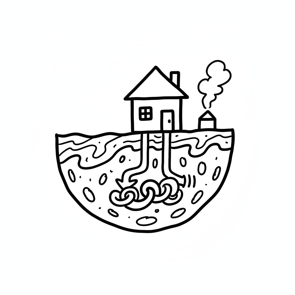 Haus mit Geothermie-Heizsystem, Rohre im Erdreich für nachhaltige Wärmegewinnung.